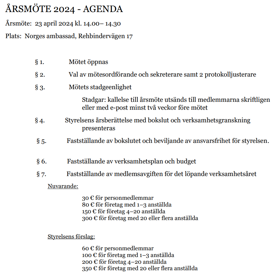 NOFI Norjalais-Suomalainen Kauppayhdistys r.y. kutsuu jäseniään vuosikokoukseen 2024. Vuosikokouksessa käsittelemme lakisääteiset asiat. Ehdotus alla.