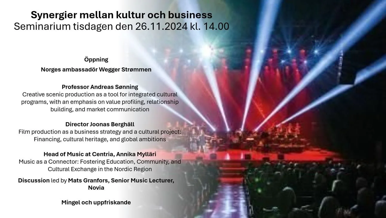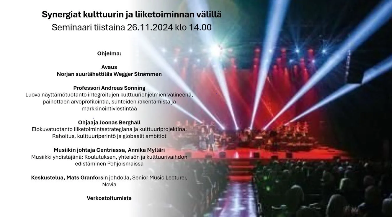 NOFI, Norjalais-Suomalainen kauppayhdistys, yhteistyössä Norjan suurlähetystön kanssa, kutsuu jäseniään ja muita yhteistyökumppaneita seminaariin, joka käsittelee kulttuurin ja liiketoiminnan synergioita. Norjan suurlähettiläs Wegger Strømmen avaa seminaarin, ja kansanmusiikkiduo Stensöta toivottaa osallistujat tervetulleiksi.