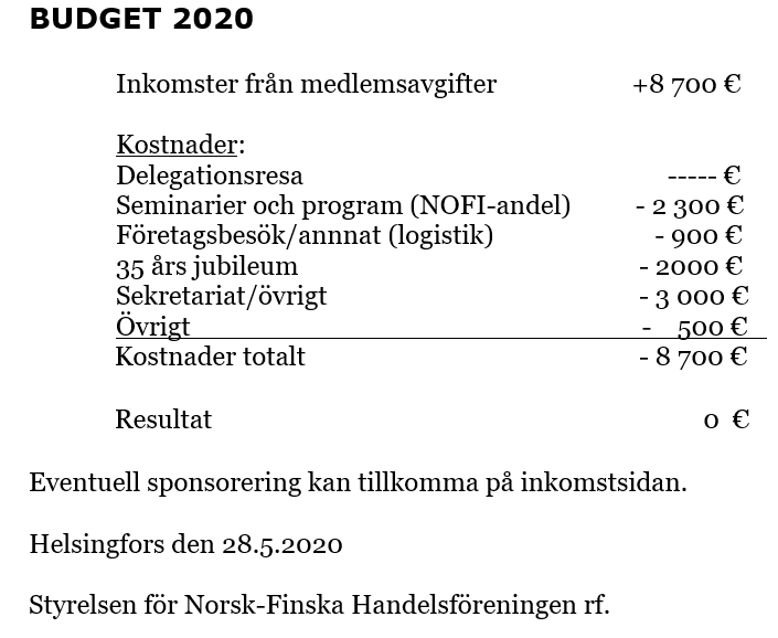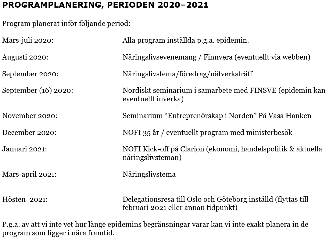 På grund av coronaepidemin har vi tyvärr inte kunnat ordna de tänkta programmen, bland annat ett entreprenörskapsseminarium i Vasa den 28.4.2020. Vi ser alla fram emot den tid då vi kan också fysiskt mötas och umgås normalt igen. Vi skall även komma ihåg att NOFI fyller 35 år i år och det skall vi fira så snart det är möjligt. Norsk-Finska Handelsföreningen tackar alla medlemmar, Norges ambassad, Innovasjon Norge, Nordiska Investeringsbanken, Pohjola-Norden och alla i nätverket för det suveräna samarbetet under året som gått.